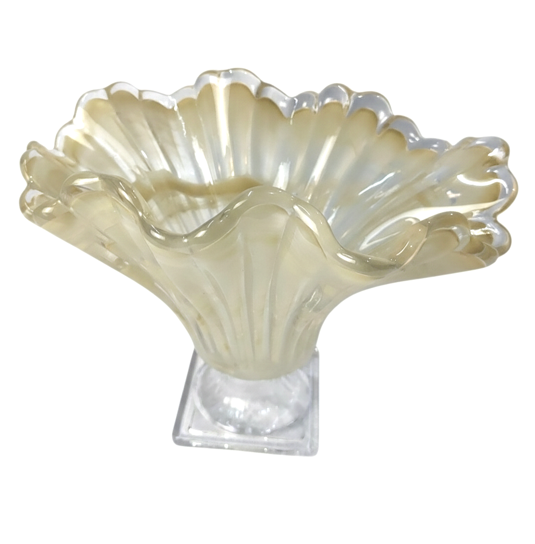 This stunning artisan glass “Jardineira” bowl combines classic Venetian style with a bold, architectural form. The wide, scalloped rim and ribbed texture provide a unique visual depth, while the clear square pedestal base ensures stability and elegance. Whether used to display fresh fruit or as a standalone art piece, its warm tones and crystalline clarity add instant luxury to your space.