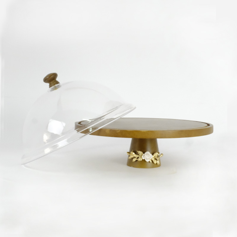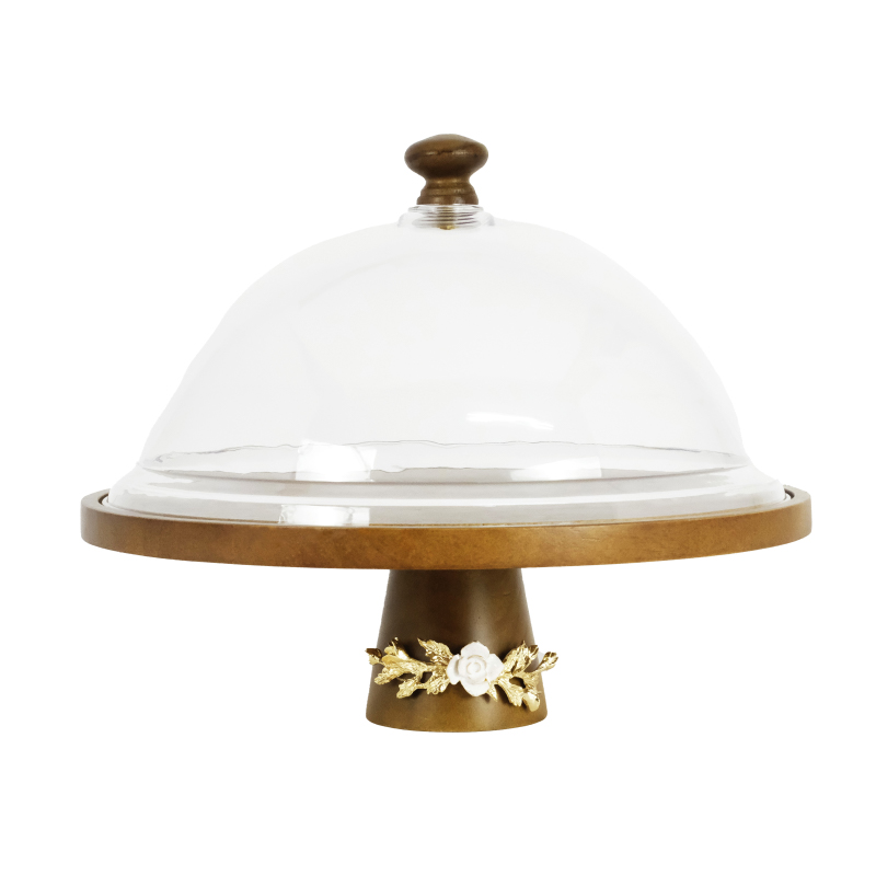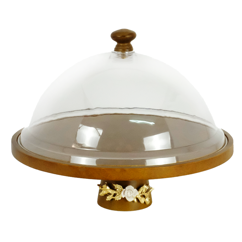 Deluxe wooden cake plate with wooden base and acrylic cover.